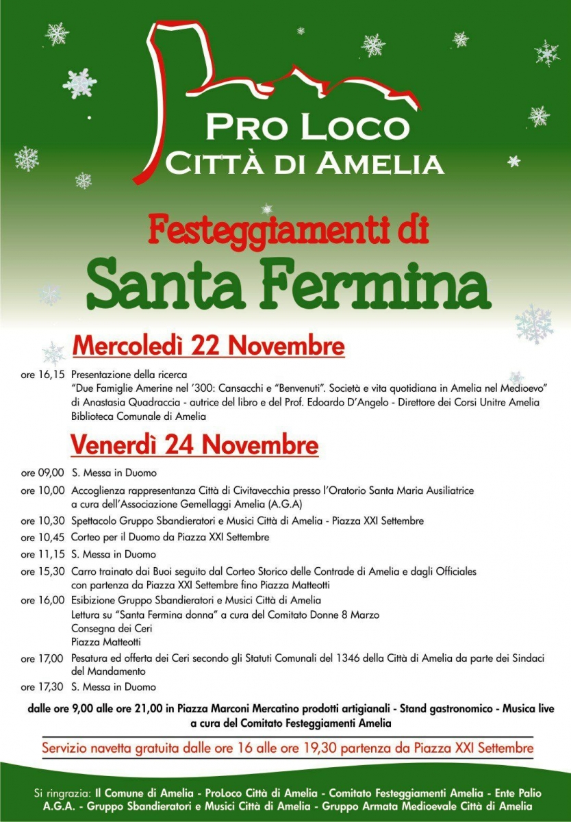 La proloco della città di Amelia il 24 Novembre di questo anno propone il solenne festeggiamento della patrona Santa Fermina.
