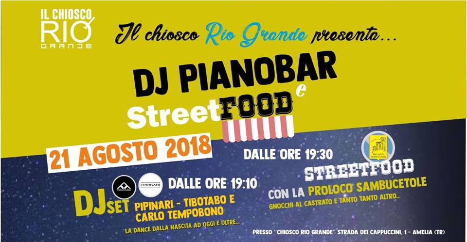 Martedì 21 Agosto al Chiosco del Rio Grande di Amelia protagonisti assoluti: cibo e musica. Con arrosticini di pecora, gnocchi al castrato, supplì e patatine, fiori di zucca fritti, salsicce arrosto e tanta musica grazie a "I Pipinari", "Tibotabo" e Carlo Tempobono.