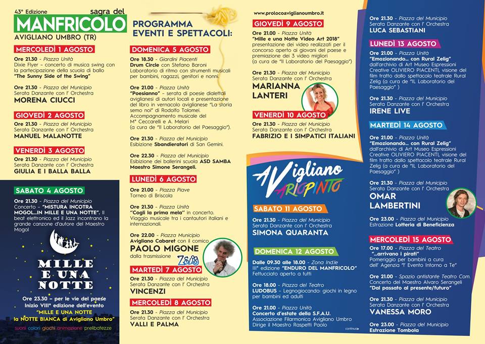 Con l'arrivo di Agosto parte la 43a edizione della Sagra del Manfrincolo! Tanti gli eventi in programma tra cui sabato 04 Agosto la notte bianca per le vie del paese, ma anche cultura e spettacoli di cabaret, schiuma party e concerti e naturalmente non può mancare la gastronomia e mercatini artigianali.